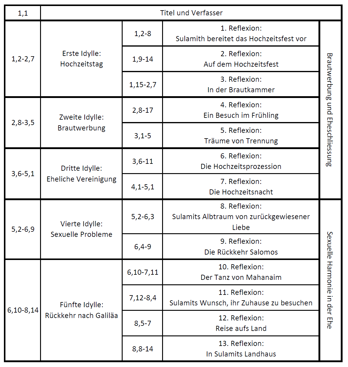 Der Schlüssel zum Hohelied ist einmal mehr die Einteilung des Buches. Wie in der hebräischen Weisheitsliteratur üblich, ist eine Chronologie in unserem Sinne nicht möglich. Die Themen kommen und gehen in unregelmässigen Zyklen wie wir das beispielsweise bei den Psalmen und den Sprüchen sehen. Beim Prediger sind die Kreisläufe der Sinnlosigkeit ein Vorgeschmack auf die Hölle und beim Hohelied sind die Kreisläufe der Liebe ein Vorgeschmack auf den Himmel. In unserer Kultur wäre dieselbe Geschichte ein klassisches fünf Akt Stück von Exposition bis Ende, aber hier wird sie in Zyklen und damit nicht chronologisch erzählt. Treffend bezeichnet Fruchtenbaum die fünf Hauptteile als Idyllen und in diesen Idyllen gibt es sogenannte Reflexionen, die zu verschiedenen Zeiten in diesen Idyllen spielen. Man kann sich das in etwa so vorstellen, dass eine Idylle ein schönes Gemälde darstellt und die Reflexionen die darin gezeichneten Szenen wiederspiegeln.