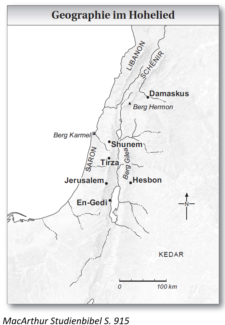 Die genannten Gebiete erstrecken sich vom Libanon (Phönizien) und Damaskus (Syrien) im Norden bis zu En-Gedi (judäische Wüste) und Kedar (arabische Wüste) im Süden. Dies weist auf die Zeit des geeinten Königreiches hin, es wird die Schönheit des ganzen Landes Israel hervorgehoben inklusiv den beiden geschichtsträchtigen Bergen Hermon und Karmel. Auch interessant ist die Erwähnung der Stadt Tirza, die wegen ihrer Schönheit nach der Teilung des Reiches von Jerobeam I. zur Hauptstadt des Nordreiches ernannt wurde bis König Omri Samaria als neue Hauptstadt aufbaute. Wir sehen, dass alles wunderbar zu Salomo und seine Zeit passt.