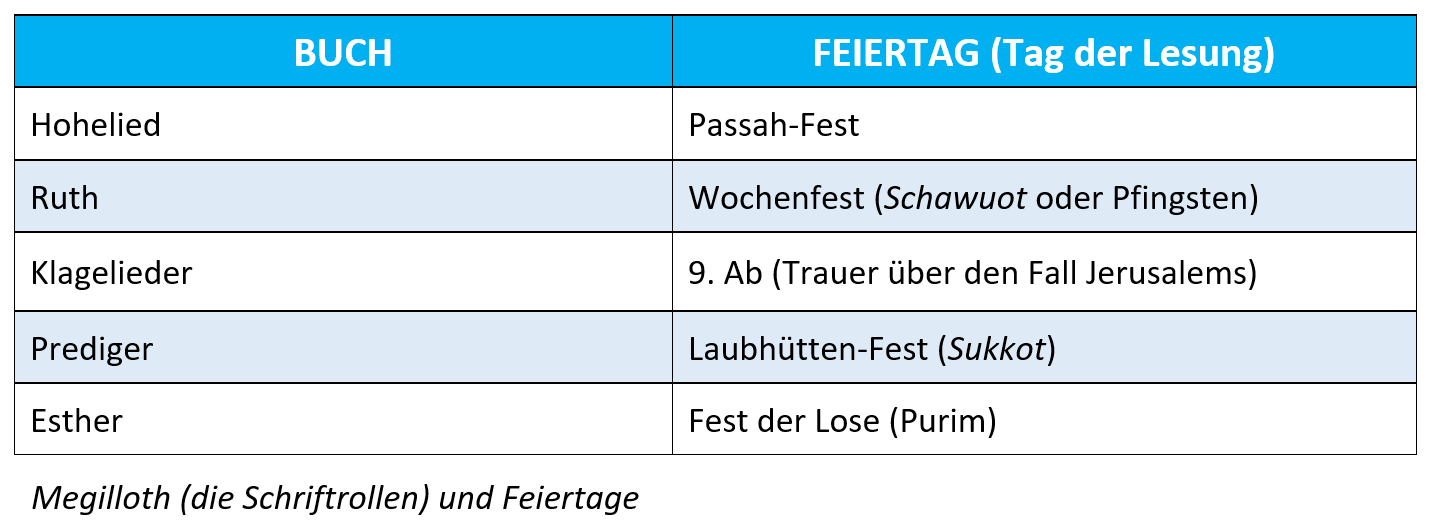 In unseren Bibeln finden wir das Hohelied unter den Poesie Büchern gleich hinter dem Prediger Buch. Die Juden hingegen haben es unter die Schriften eingeordnet und dort gibt es fünf Bücher, die zusammen die sogenannten Megilloth (übersetzt Schriftrollen) bilden. Diese fünf Bücher werden jeweils einmal im Jahr an einem ganz bestimmten Fest in den Synagogen gelesen, wobei 2 Feste auf Grund dieser Bücher eingesetzt wurden (9. Ab (Ende Juli) als Trauerfest, Purim-Fest) und die Verbindung zwischen Buch und Fest hier somit sehr klar ist. Bei drei Festen wurde das Buch jedoch erst nach der Einsetzung der Feste verfasst (Passah-Fest, Pfingstfest und Laubhütten-Fest), das heisst die Juden sahen bei diesen drei Büchern eine sehr enge Beziehung zu diesen jeweiligenFesten.
