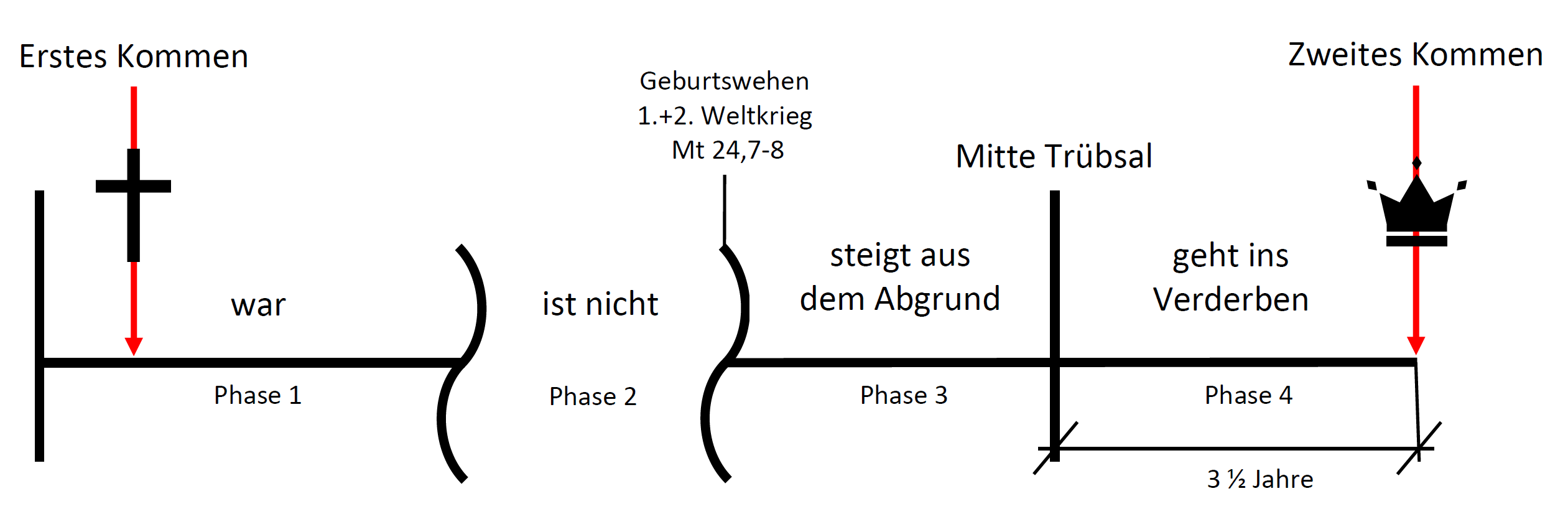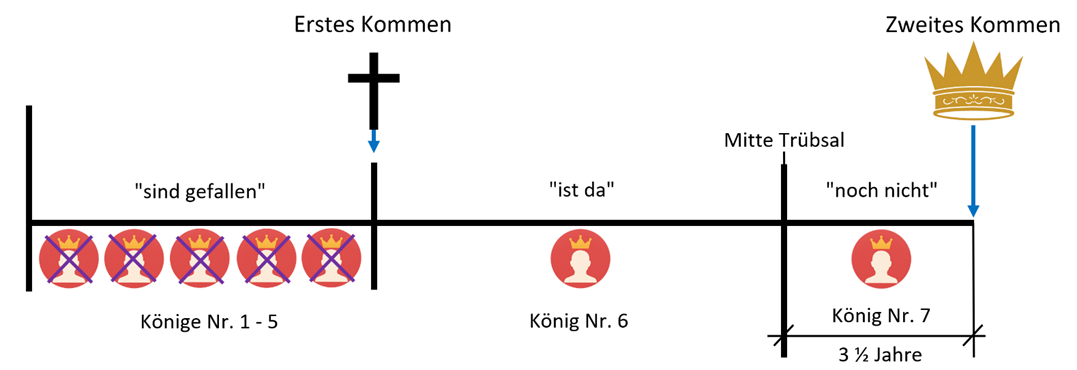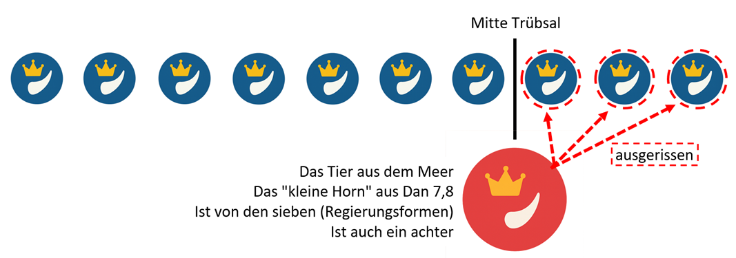 Erst zur Mitte der Trübsal wird das Tier die absolute Herrschaft antreten und eine siebte und letzte Regierungsform Roms einläuten. Diese Regierungsform darf nur "eine kurze Zeit bleiben", nämlich für 3½ Jahre. Heute befinden wir uns in der sechsten Regierungsform, die siebte ist noch zukünftig. Dies ergibt folgende graphische chronologische Darstellung: