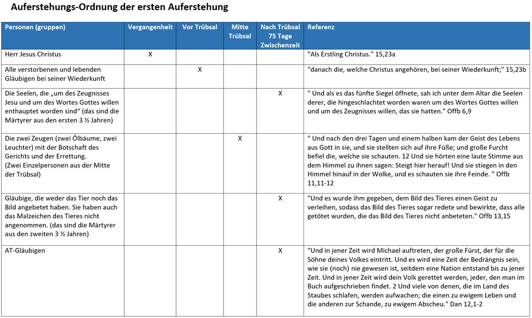 Während die erste Gruppe, d.h. die Gläubigen des Gemeindezeitalters bei der Entrückung schon auferstanden sind, ist bei den beiden letztgenannten Gruppen nun der Zeitpunkt der Auferstehung gekommen - "sie wurden lebendig". Sie werden mit Christus herrschen in seinem Reich.