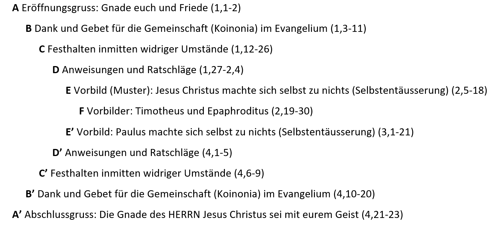 Die Auslegung des Philipperbriefes erfolgt gemäss folgender Spiegelstruktur. Diese wird im Verlaufe des Kommentars ausführlich erklärt.